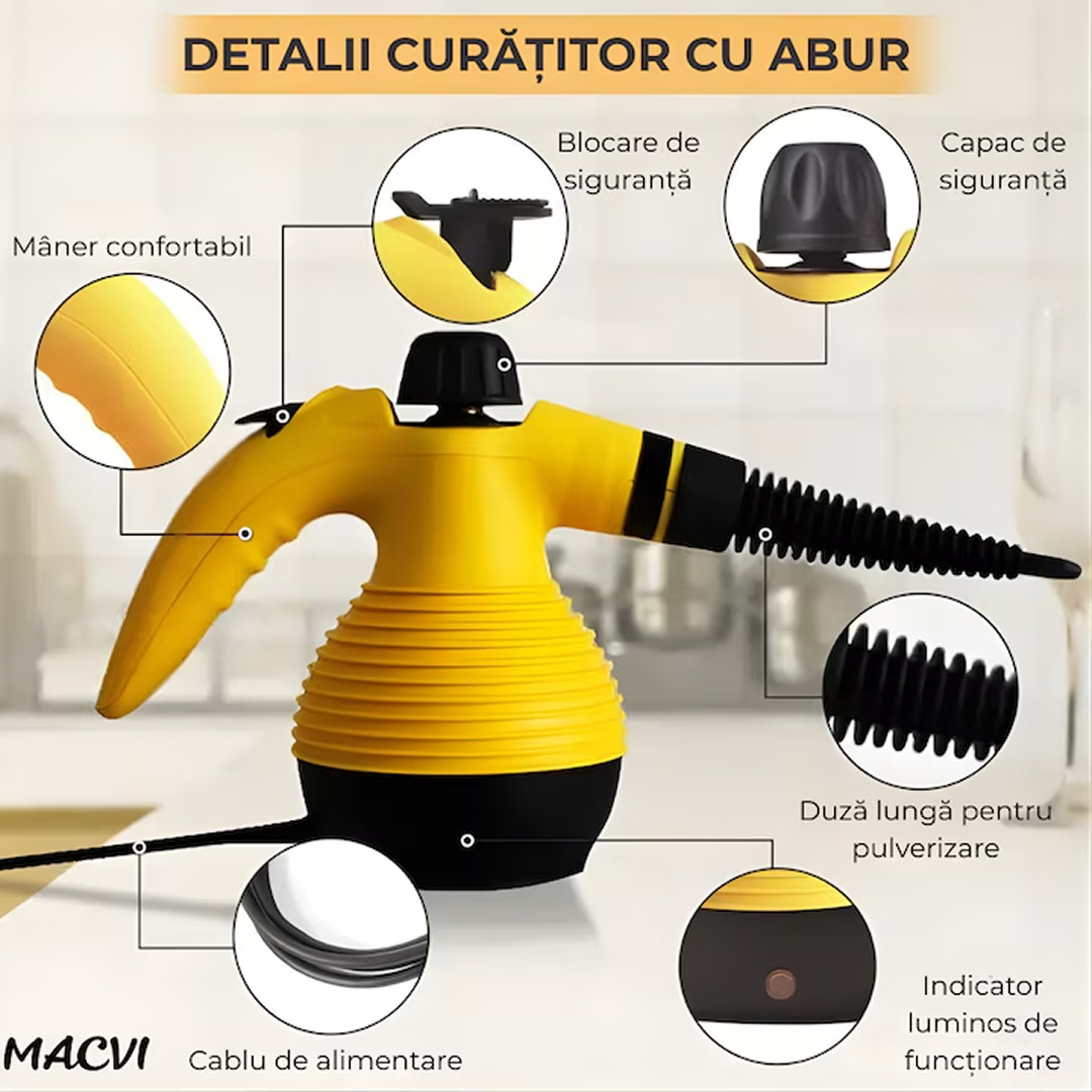 Aparat de curatat cu aburi portabil, ideal pentru igienizare profunda fara detergenti. Curata eficient murdaria, bacteriile si grasimea folosind doar abur fierbinte.