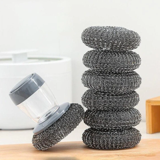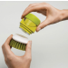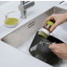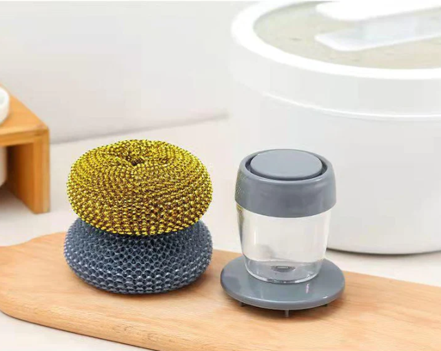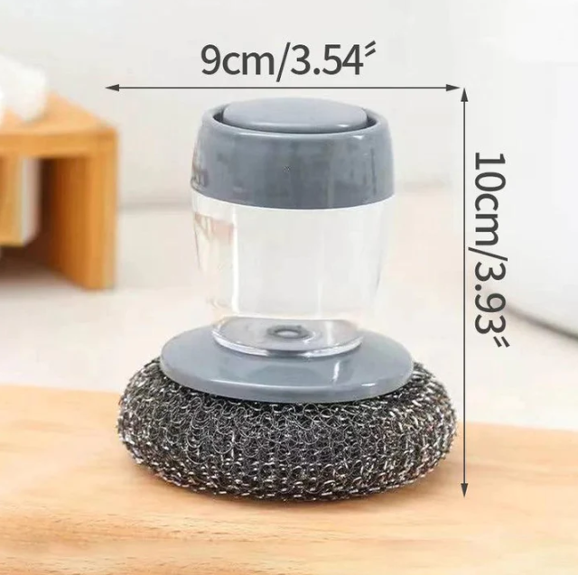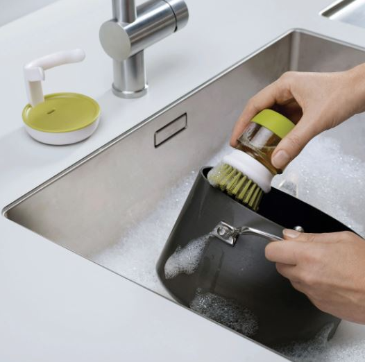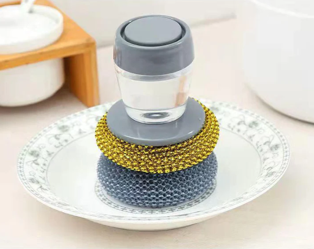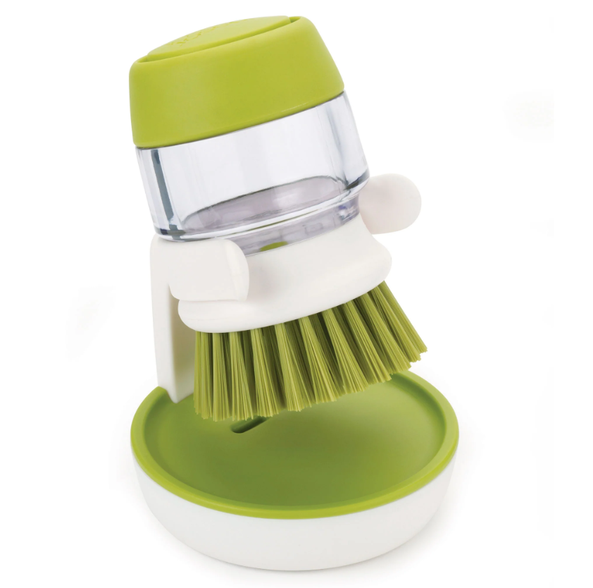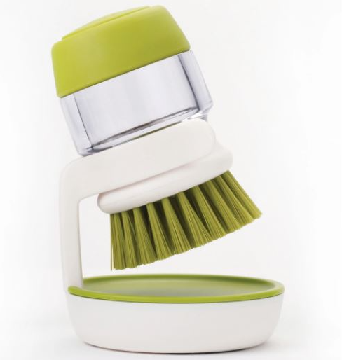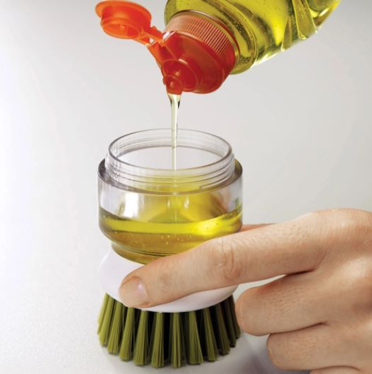 Perie de vase cu recipient pentru detergent. Această perie pentru spălat vase are un rezervor de umplere uşor, care distribuie cantitatea necesară de detergent cu o simplă apăsare a butonului de sus. Este ideală pentru vase şi tigăi şi se poate umple foarte uşor cu detergent pentru a completa nivelul acestuia.