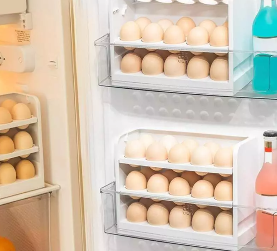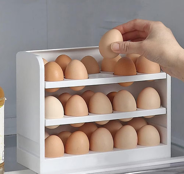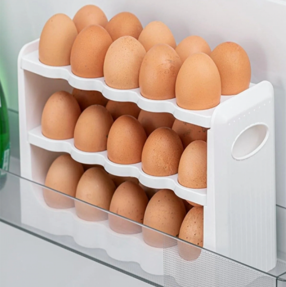 Un rol foarte important al organizatorului il reprezinta economisirea de spatiu in frigider. Cele doua straturi superioare pot fi rabatate in sus, oferind acces usor la ouale din partea de jos.