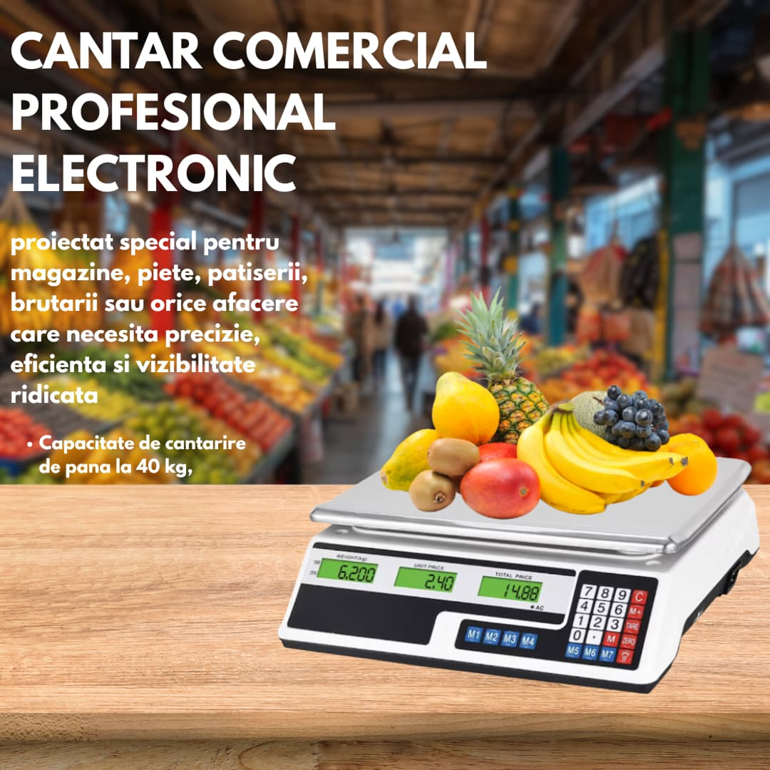 Cantarul comercial electronic este conceput pentru utilizare profesionala in magazine, piete sau unitati alimentare unde este necesara cantarirea rapida si precisa a produselor. Cu o capacitate maxima de 40 kg si afisaj digital dublu iluminat, dispozitivul permite citirea clara a greutatii atat de catre operator, cat si de catre client. Suprafata de cantarire este realizata din otel inoxidabil, oferind rezistenta si igiena in utilizare zilnica.