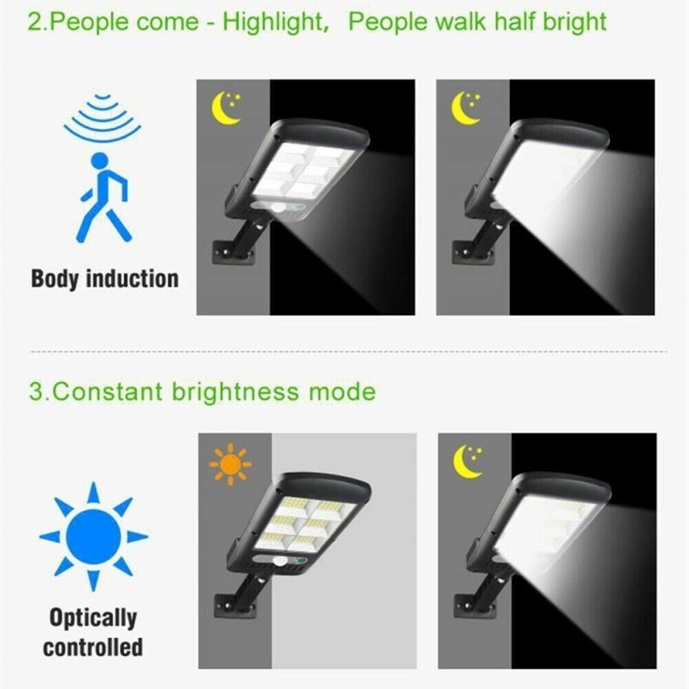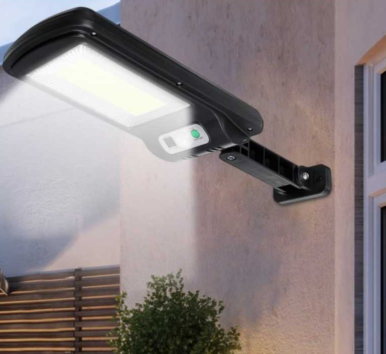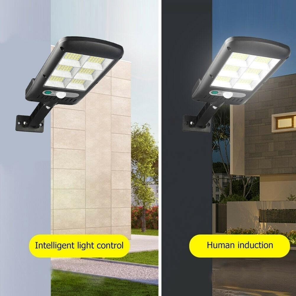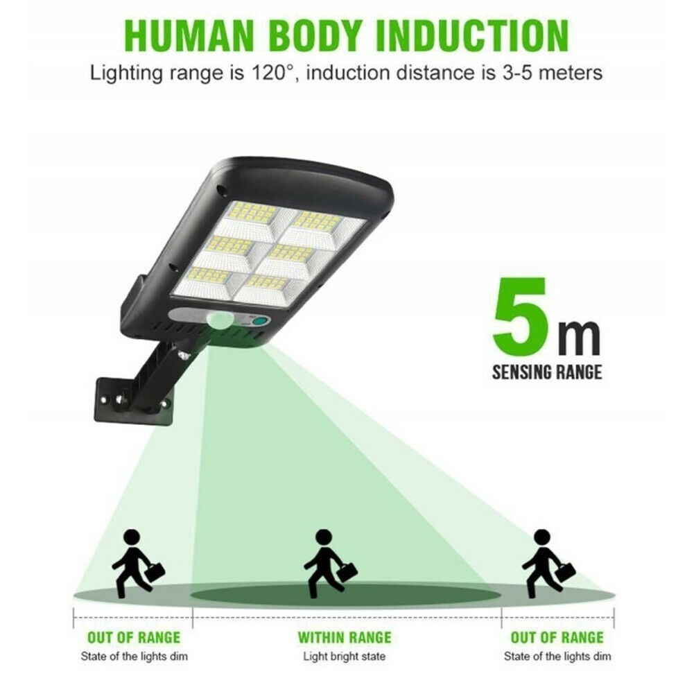 Lampa solara stradala 225 LED SMD, cu senzor de miscare, panou solar incorporat, brat de montare inclus si telecomanda cu functii multiple de setare a intensitatii luminoase si timpului de functionare teleMAG