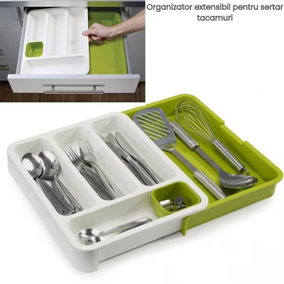 Organizator extensibil pentru sertar, ideal pentru pastrarea tacamurilor ordonate si la indemana. Design ajustabil si compartimente adanci pentru organizare eficienta in orice bucatarie.
