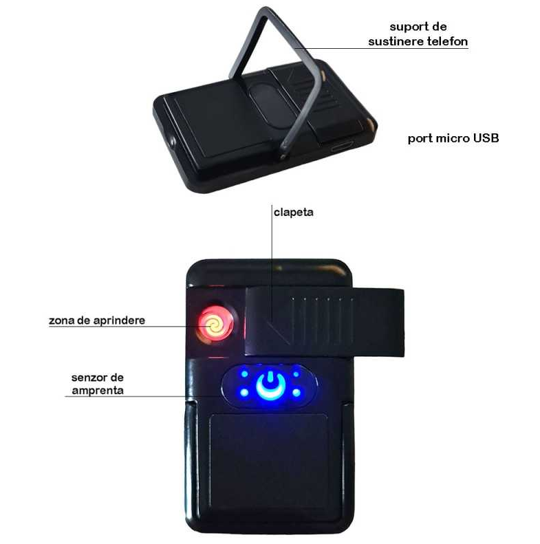 Bricheta Electrica Antivant 2 in 1 , Cu Suport Telefon, Senzor de Aprindere, Cablu USB, Negru