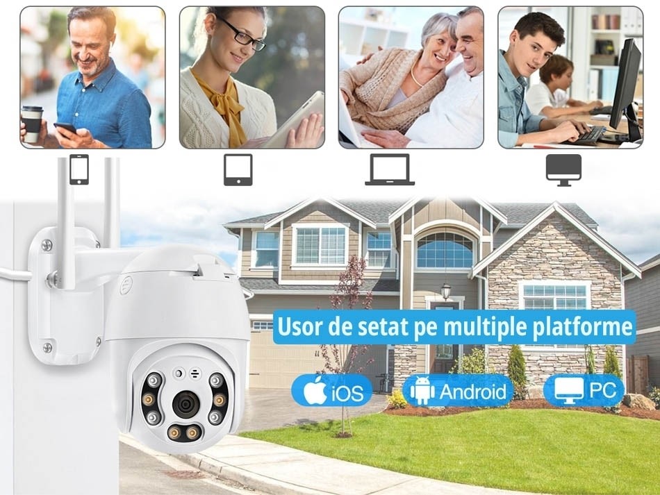 Multi Platform - Aplicatie pentru iOS si Android, Interfata WEB, ONVIF si NVR. Practic ai acces la camera de pe orice tip de device: tablete, laptop, PC, telefon, WEB, Mac, Windows, Linux etc. cat si fizic cu ajutorul unui NVR, ONVIF sau direct de pe cardul MicroSD