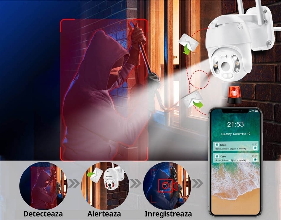 Alt avantaj al Iluminarii LED automat este acela ca intrusului poate confunda camera de supravechere cu un simplu proiector LED si senzor de miscare. Iar cu ajutorul notificarilor poti anunta imediat firma de securitate sau autoritatile pentru a prinde intrusul in flagrant.