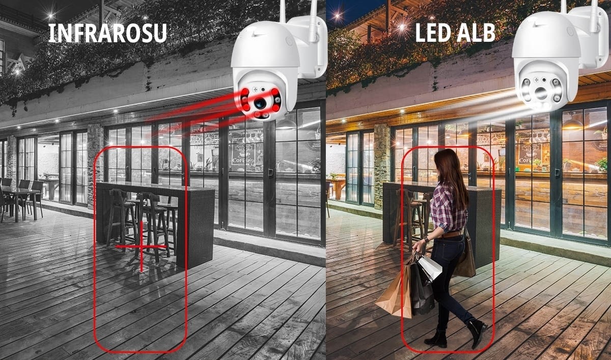 Detectare Miscare + Identificare Forma Umana - La detectarea miscarii camera filmeaza activ (se pot vedea ulterior zonele din filmare cu activitate). Pe timp de noapte, la detectarea unei forme umane, camera poate porni automat iluminarea LED pentru o imagine mult mai clara.
