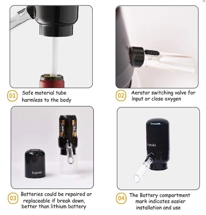 Alimentat de 4 baterii x AAA (nu sunt incluse). Produsul poate fi folosit impreuna cu vinuri roșii și albe, vinuri proaspete / îmbătrânite, whisky, scotch și beri amare pentru a vă bucura de artificii de aromă!