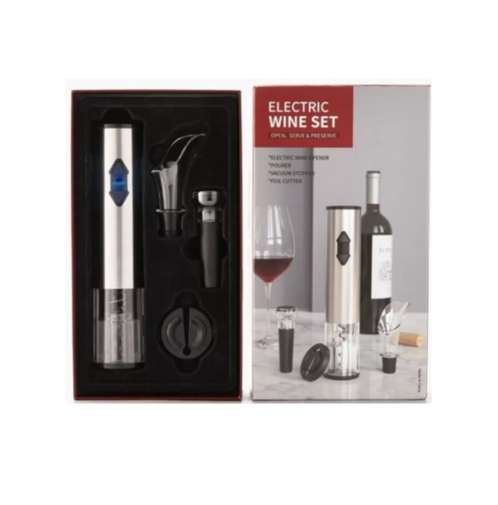 Colecția Wine Lover 4-în-1-- Pachet cu extractor electric pentru sticle de vin, cuțit de folie, conservator și turnător.