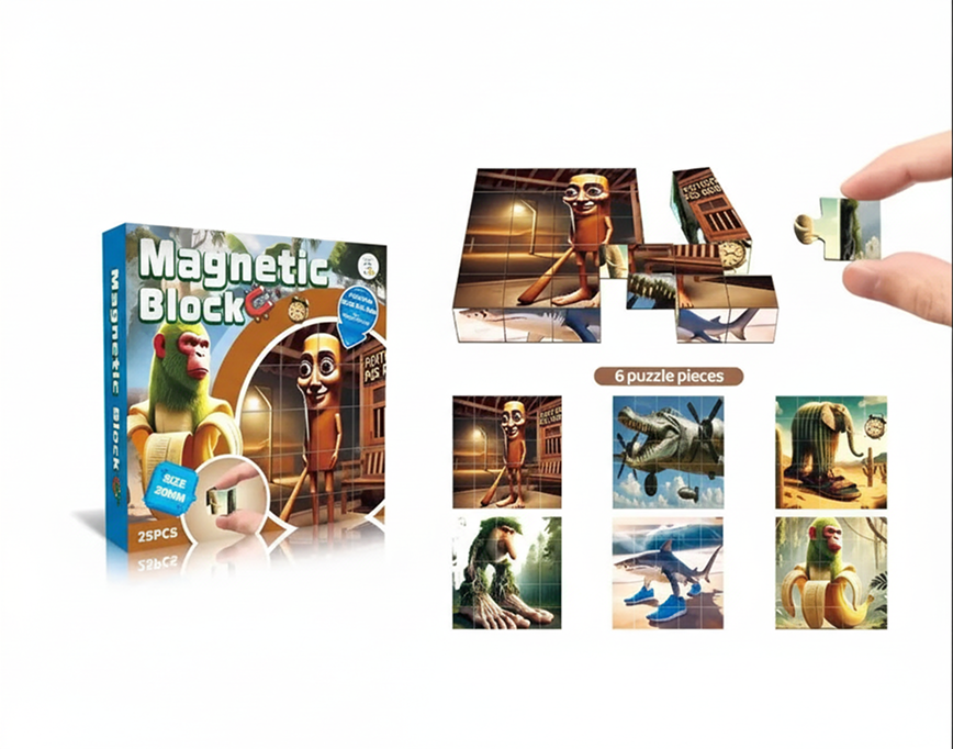 Puzzle magnetic educativ format din cuburi magnetice, destinat copiilor cu vârsta de peste 3 ani. Jocul permite asamblarea mai multor imagini diferite prin rotirea și combinarea cuburilor, contribuind la dezvoltarea logicii, creativității și coordonării mână–ochi. Pachetul conține 2 seturi (1+1), iar modelele vin aleatoriu, în funcție de stocul disponibil.